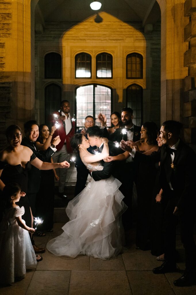 Sparklers are not just for Fourth of July celebrations; they can also add a touch of whimsy and romance to wedding photography. Meanwhile, invite your bridal party to create a sparkler tunnel for you and your partner to run or dance through. Your photographer can use a slow shutter speed to capture the trails of light as your bridal party dance around you. The sparklers will infuse the images with a sense of magic and create memorable photographs to end your wedding day! Definitely one of our favourite Wedding Reception Photo Ideas!
