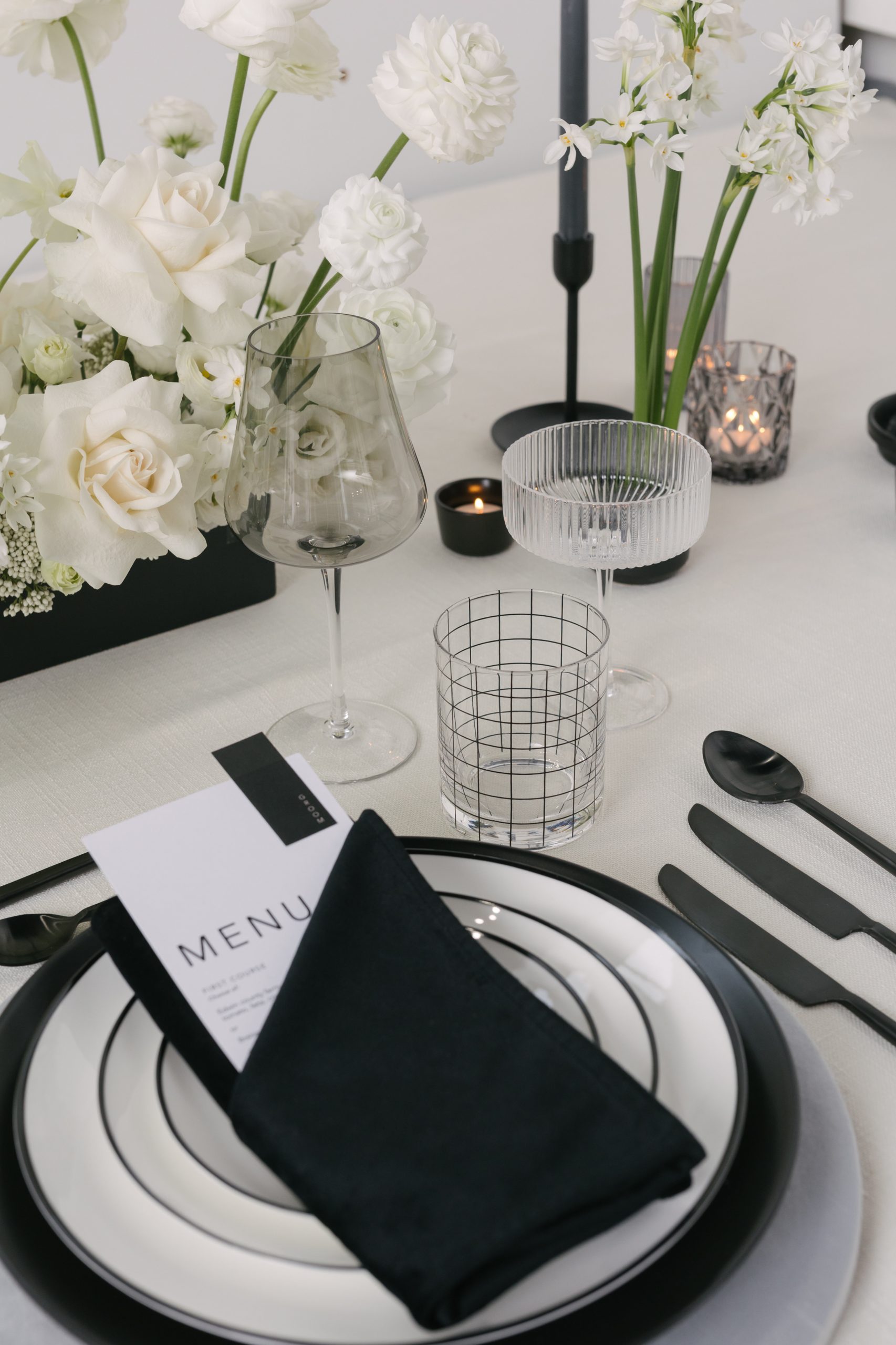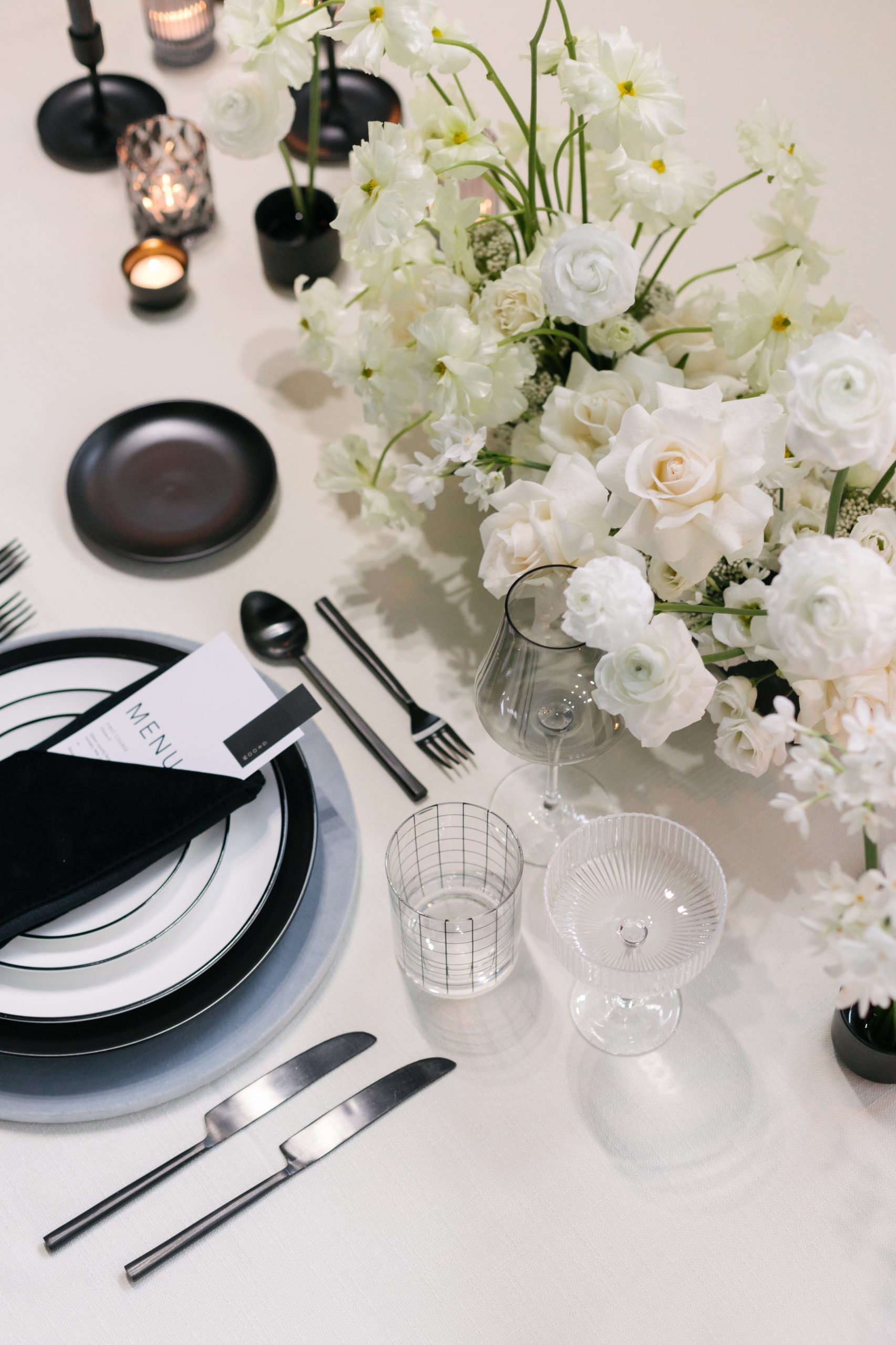 If you like clean and simple designs, the modern minimalist tablescape is perfect for you. Basically, it features simple colors like black, white, or neutrals, giving off an elegant vibe. Additionally, geometric shapes, subtle centerpieces, and clean-lined tableware take center stage. As a result, this style creates a cool, calm, and serene atmosphere, bringing a sense of sophisticated tranquility.