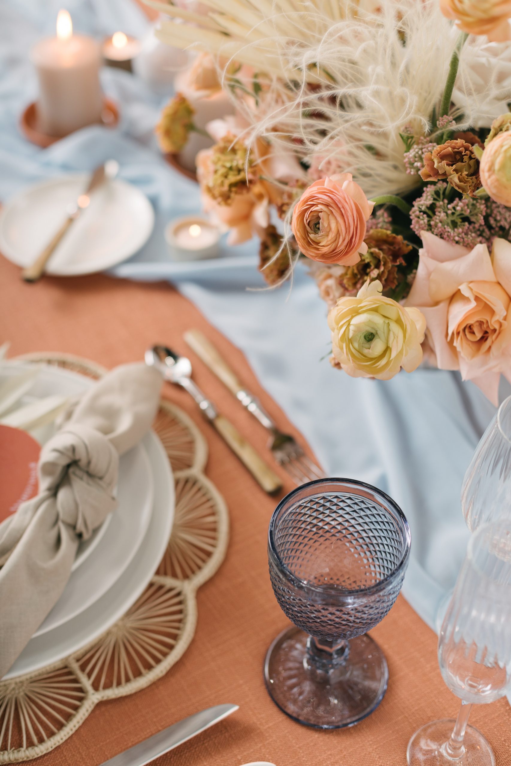 For those who adore soft colors, flowing fabrics, and delicate details that evoke whimsy, this tablescape style is perfect. Classic beauties like roses, dahlias, tulips, and baby’s breath create an enchanting floral arrangement. To enhance the ambiance, incorporate fairy lights and candles, setting a soft and romantic tone. Additionally, consider adding vintage or bohemian pieces as a nod to the past. Ultimately, this style transports guests to a truly romantic wedding experience.