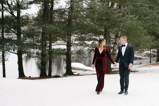 As proud Ontarians, Muskoka is forever engraved in our hearts. Even on a snowy winter day, the scenery is surreal, especially when combined with a couple decked out in elegant outfits. Sabrina and Josh are a “live-and-die” Muskoka couple when it came to their engagement session they had no doubts where they wanted to take their winter portraits. I especially love the fact that she opted for a chic, velvet gown that looked perfect in photos.