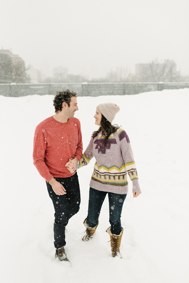 Winter engagement photos? Heck yeah! I especially love how colorful Roxy and Daniel’s outfits are and how they pop against the white-out background. Originally, we were planning on an at-home engagement session with these two, but when we saw what was happening outside we couldn’t resist the urge to dive in. I’m so glad we were able to snap a few photos on a snow-covered street of Toronto as they are so fun and playful.