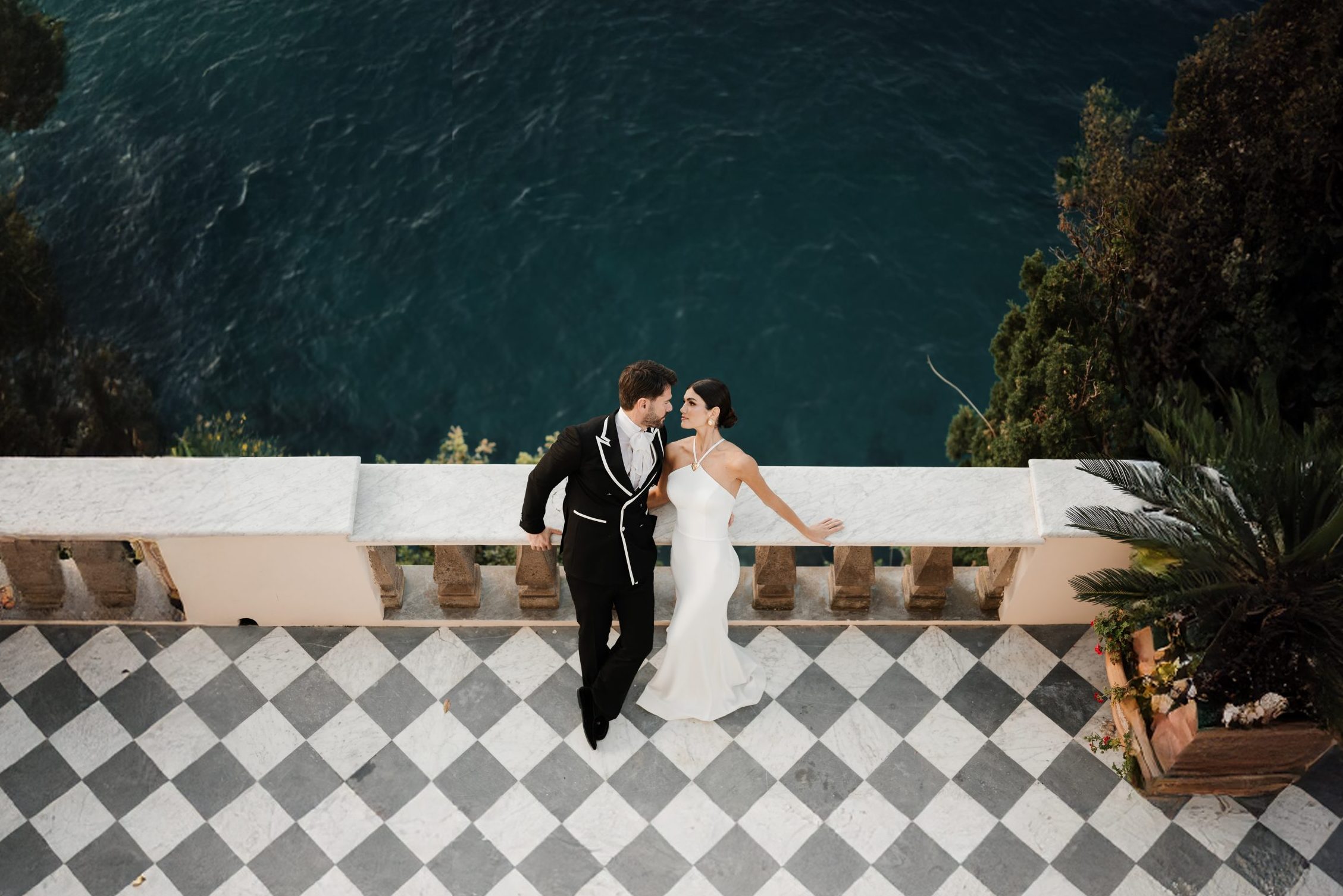 One of the most picturesque spots at Villa Astor is the terrace and the stunning window. Meanwhile, against this stunning backdrop, the bride and groom stole away for portraits, framed by the villa’s beautiful windows overlooking the scenic beauty.