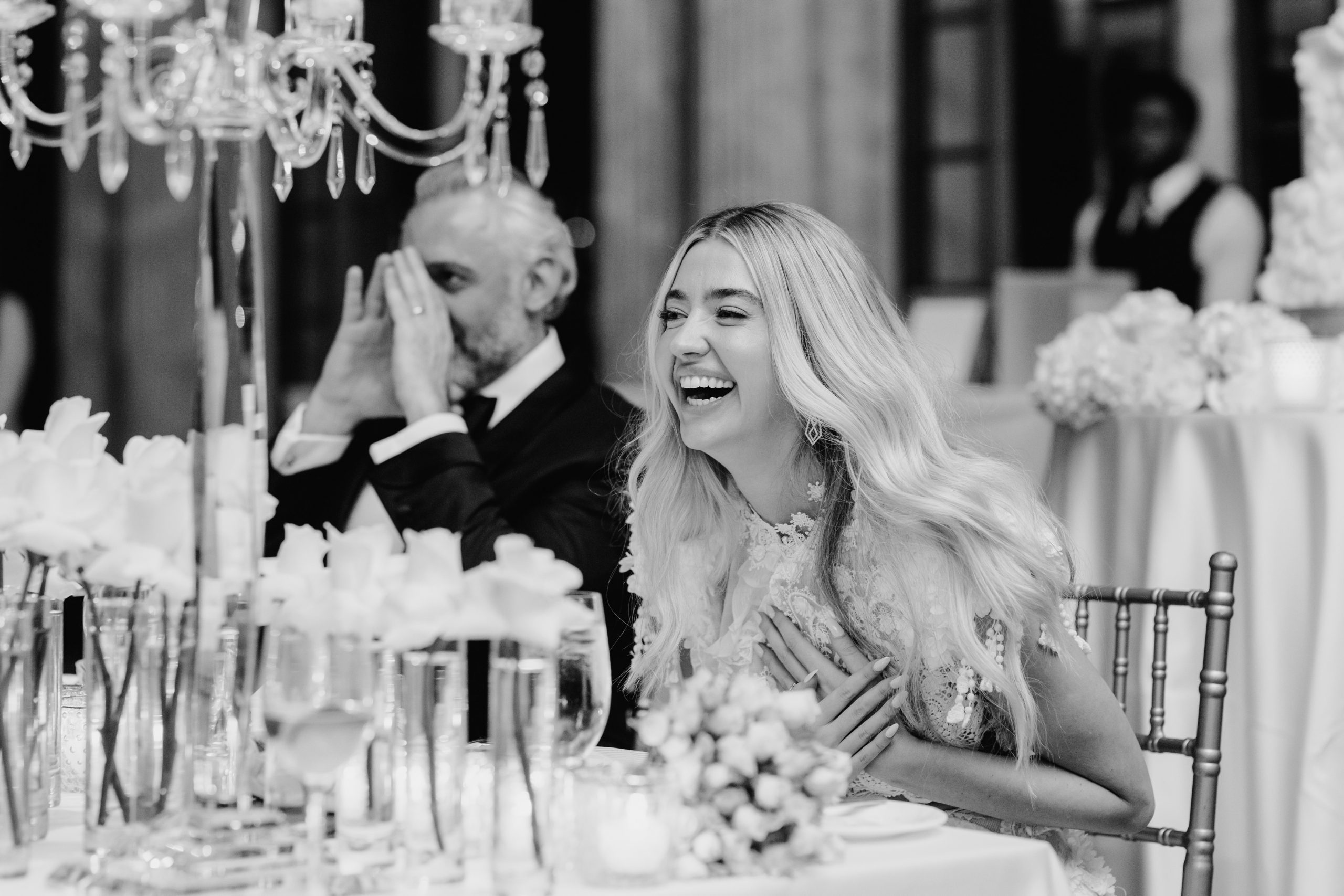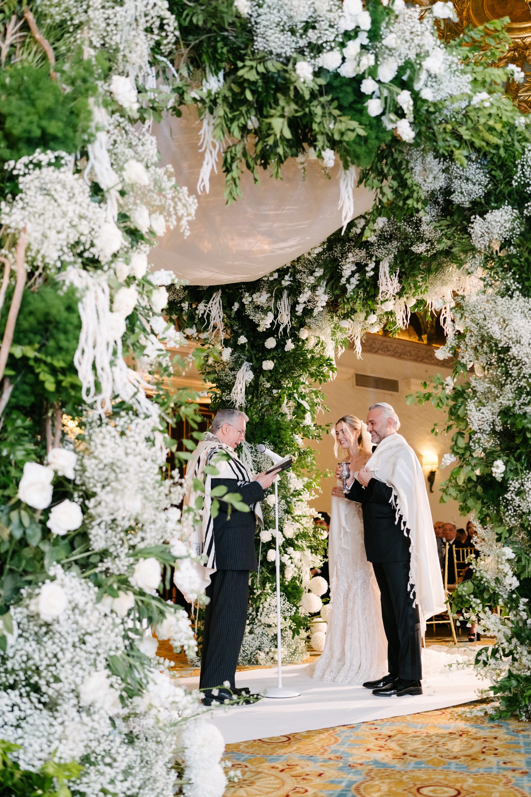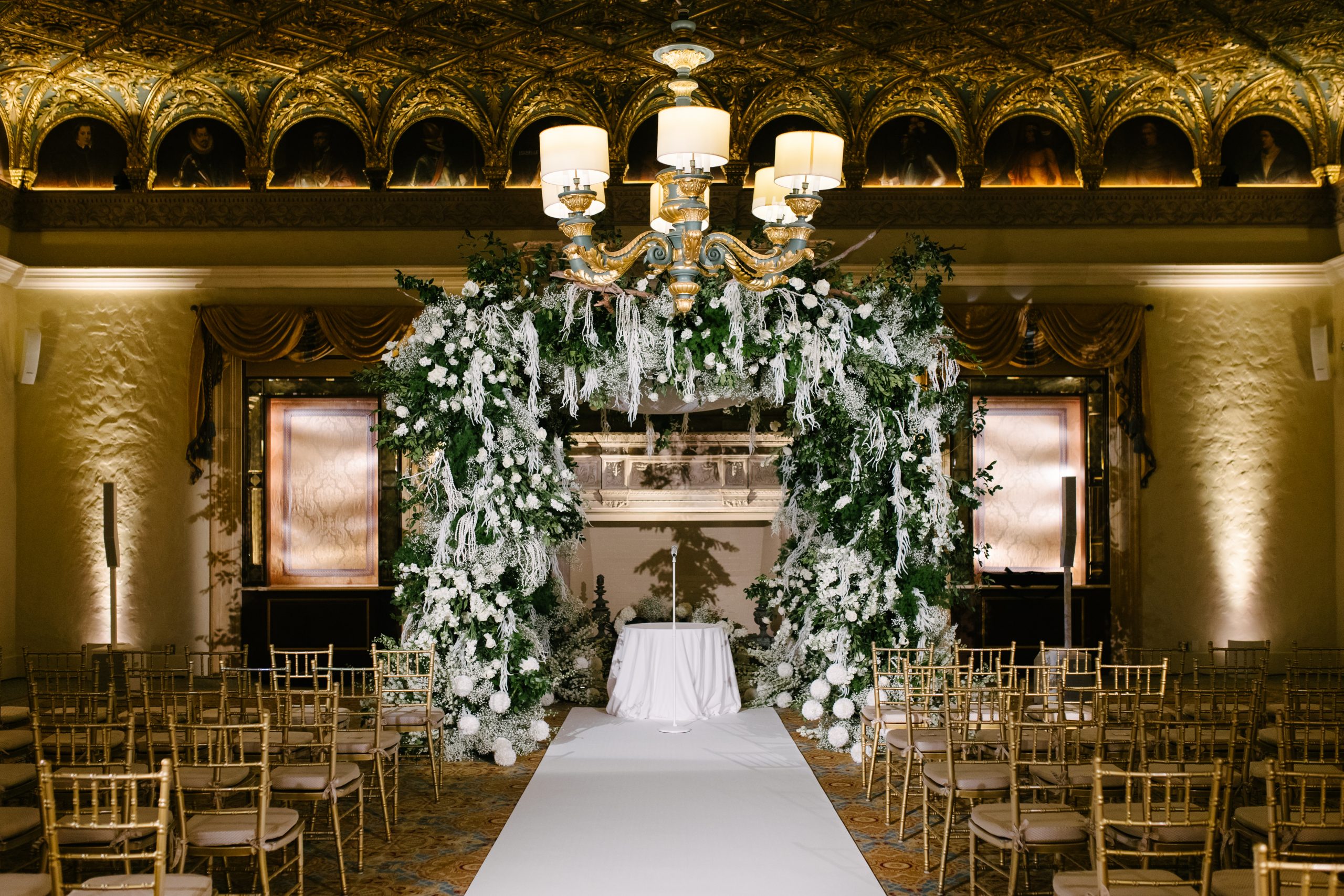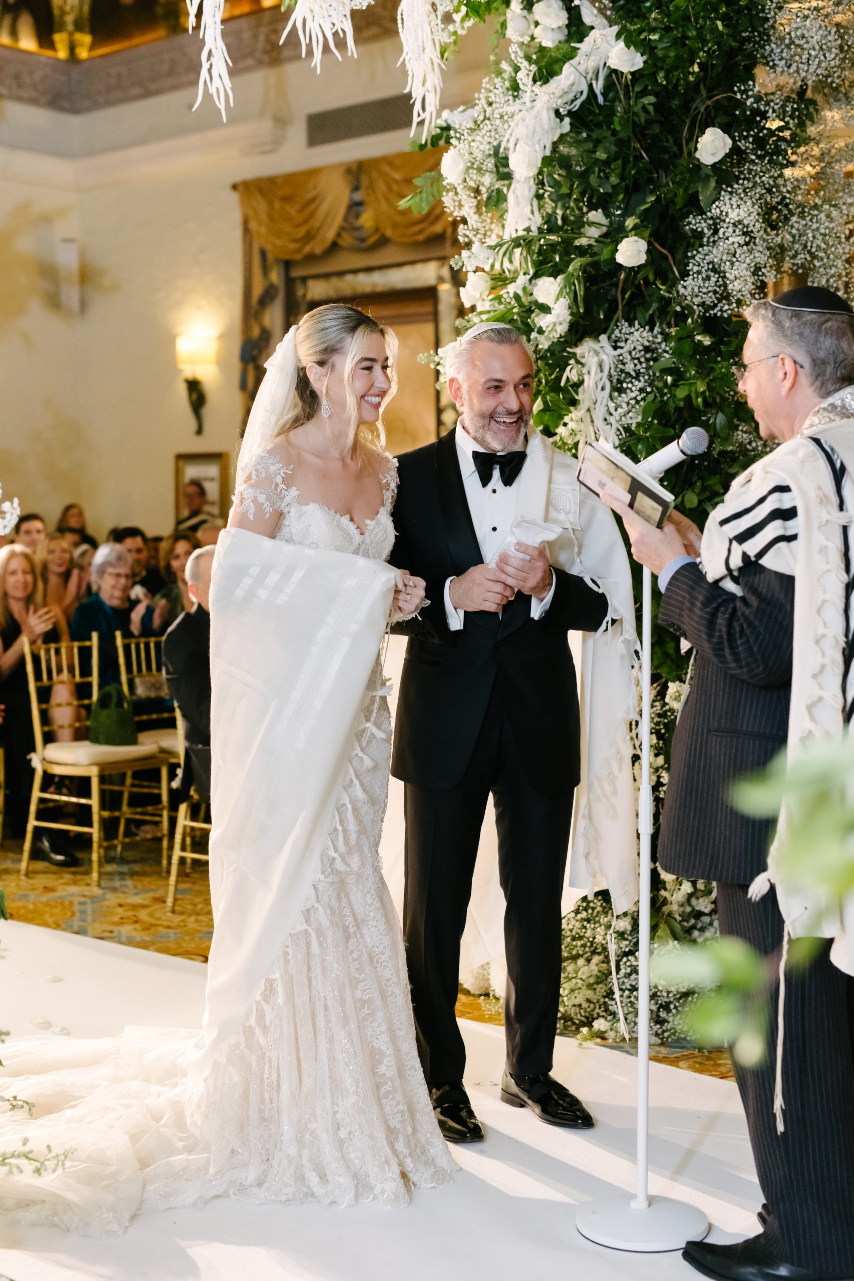 The following day, amidst the elegance of a stunningly adorned room, Kelsey and Afshin exchanged heartfelt vows. Moreover, the architecture complemented by cascading white flowers and lush greenery arch formed a picturesque setting for their union.