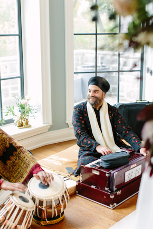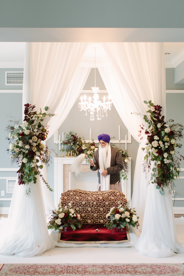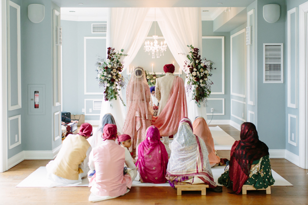 The couple’s closest family and friend gathered together in an elegant ballroom early morning on that day. The wedding started with a Sikh ceremony to pay tribute to Milan’s family roots. Facing the room’s vintage fireplace, the ceremony was overflowing with a soft, magical morning light. I really loved the toned down floral centrepieces surrounding the ceremony site that added a welcome touch of modern elegance.