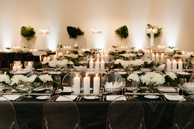 Planned and designed by Melissa Baum with Brittany and Lyndon’s own modern and minimalist aesthetic in mind, their wedding ceremony and reception featured ultra-modern and sleek elements using black and white color palette. I really loved how everything, from the flowers to the graphic seating chart, added sculptural sensibility focusing on modern sleek lines with an architectural sense of structure and three-dimensionality. Starting with a blank slate, Melissa Baum and her team layered texture and modern design details to accentuate the venue’s beautiful interior. The talented florists at Nous Design Group used pretty white flowers and chic tropical leaves to bring that graphic element into the decor. All in all, this ultra modern, black and white Gardiner Museum is a proof you don’t need color to make your wedding decor pop!