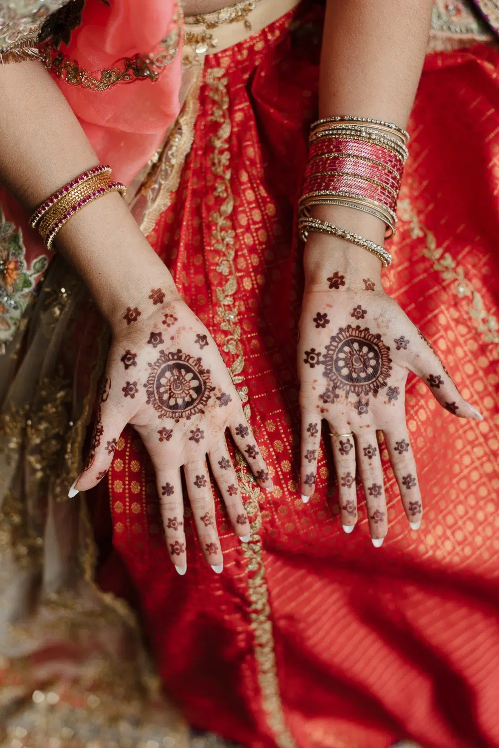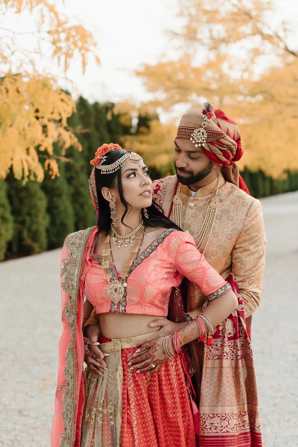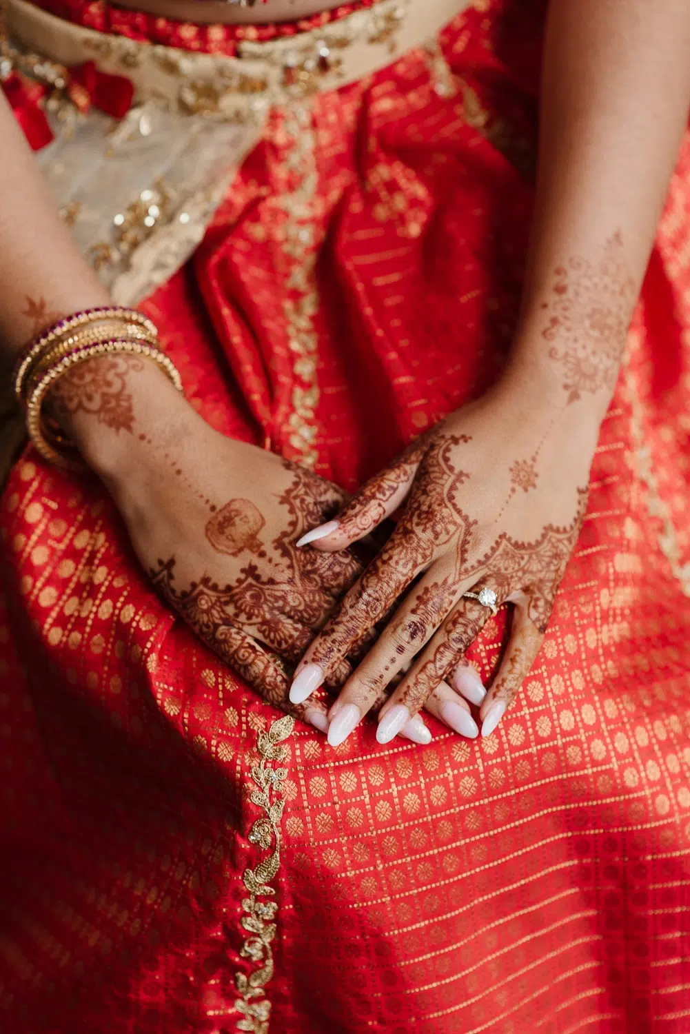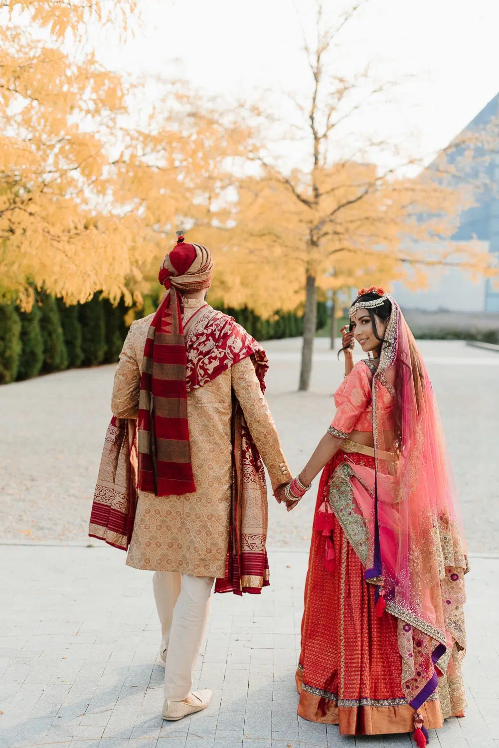 Our main goal was to capture every raw emotion and bright colour of Shriya and Alex’s traditional Hindu wedding ceremony. The bride’s tears of joy and the family’s jubilant celebration made our job a joy to capture such lively emotions. However, it wasn’t just the emotions that were vibrant – the fall colours of the Aga Khan Museum provided a stunning backdrop for the couple’s creative portrait session. As a result, it seemed like even Mother Nature was swept up in the romance! The warm hues of orange, red, and gold created a dreamy atmosphere. As photographers, we strive to capture the essence of every moment, and this ceremony was no exception. In addition to the details of Shriya’s stunning attire, the intricate designs of the Henna was a masterpiece. For this reason, every element on the wedding day felt like a work of art.
