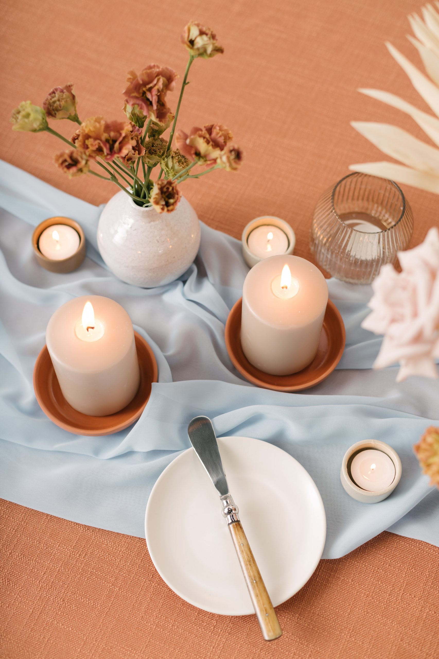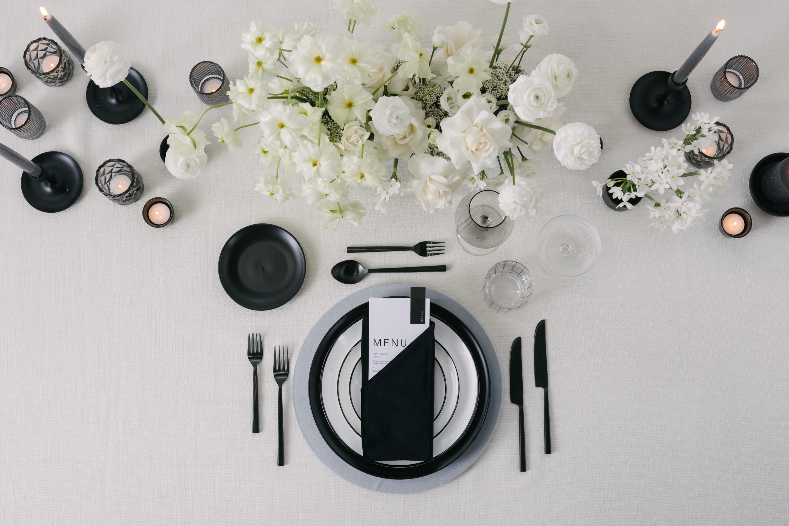 If you like clean and simple designs, the modern minimalist tablescape is perfect for you. Basically, it features simple colors like black, white, or neutrals, giving off an elegant vibe. Additionally, geometric shapes, subtle centerpieces, and clean-lined tableware take center stage. As a result, this style creates a cool, calm, and serene atmosphere, bringing a sense of sophisticated tranquility.