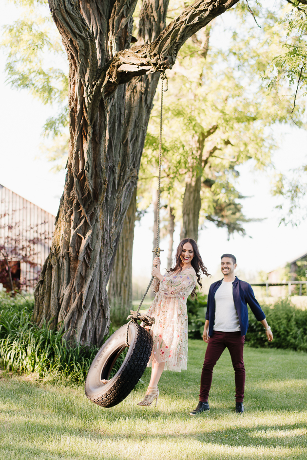 Spending some quality time at a family farm makes for some down-to-earth photos. Malisa and Salvatore recently bought a house on a farm together and wanted to capture the time when they were in the process of rebuilding their new home. I especially love the action and intimacy of this photo. With Malisa playfully swinging on a tire and Salvatore cheerfully supporting her, there’s something utterly romantic and care-free about this setting.