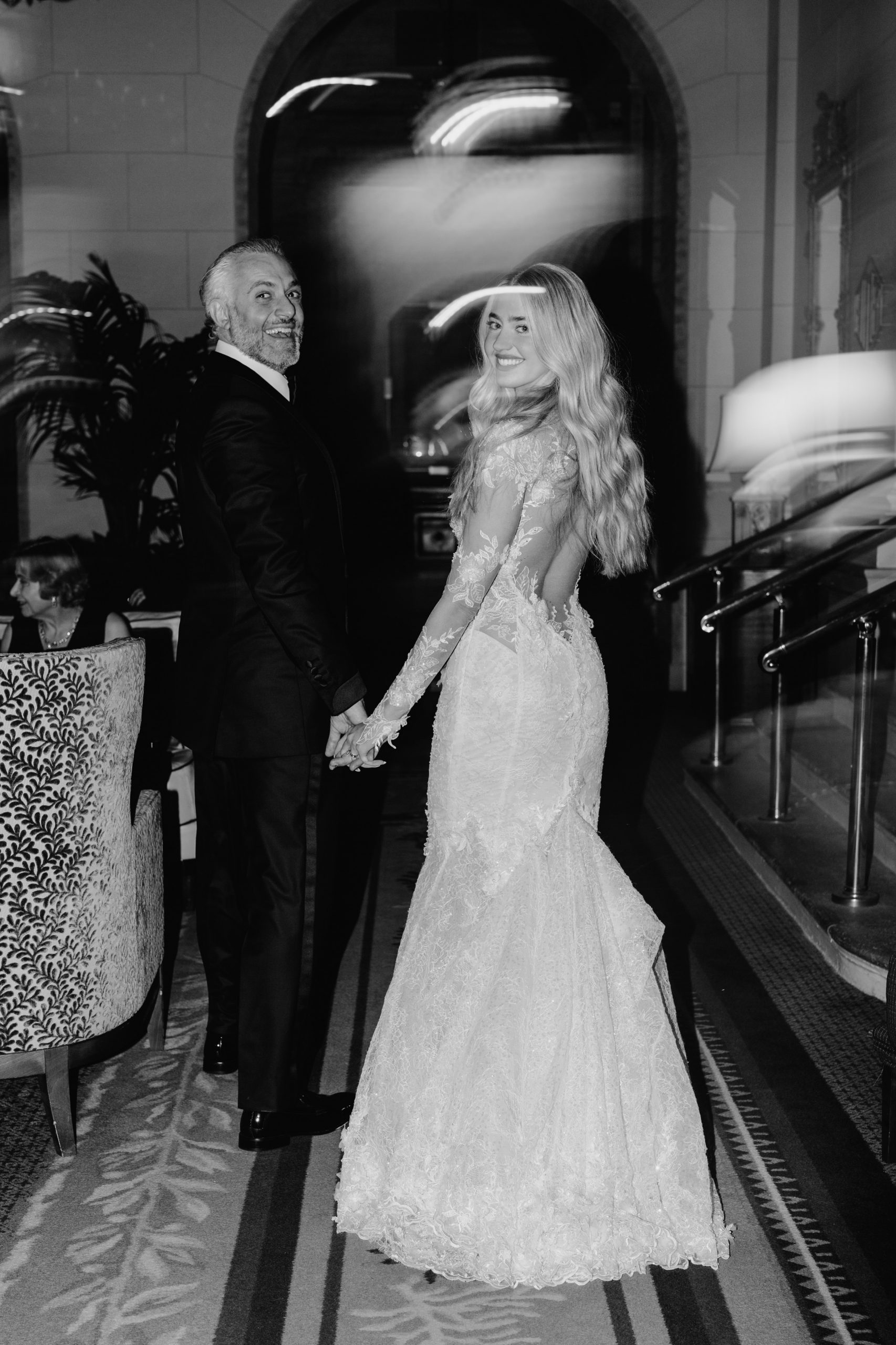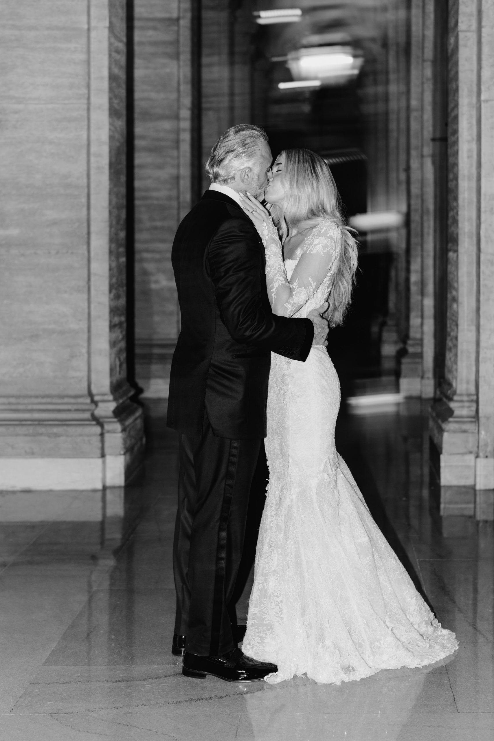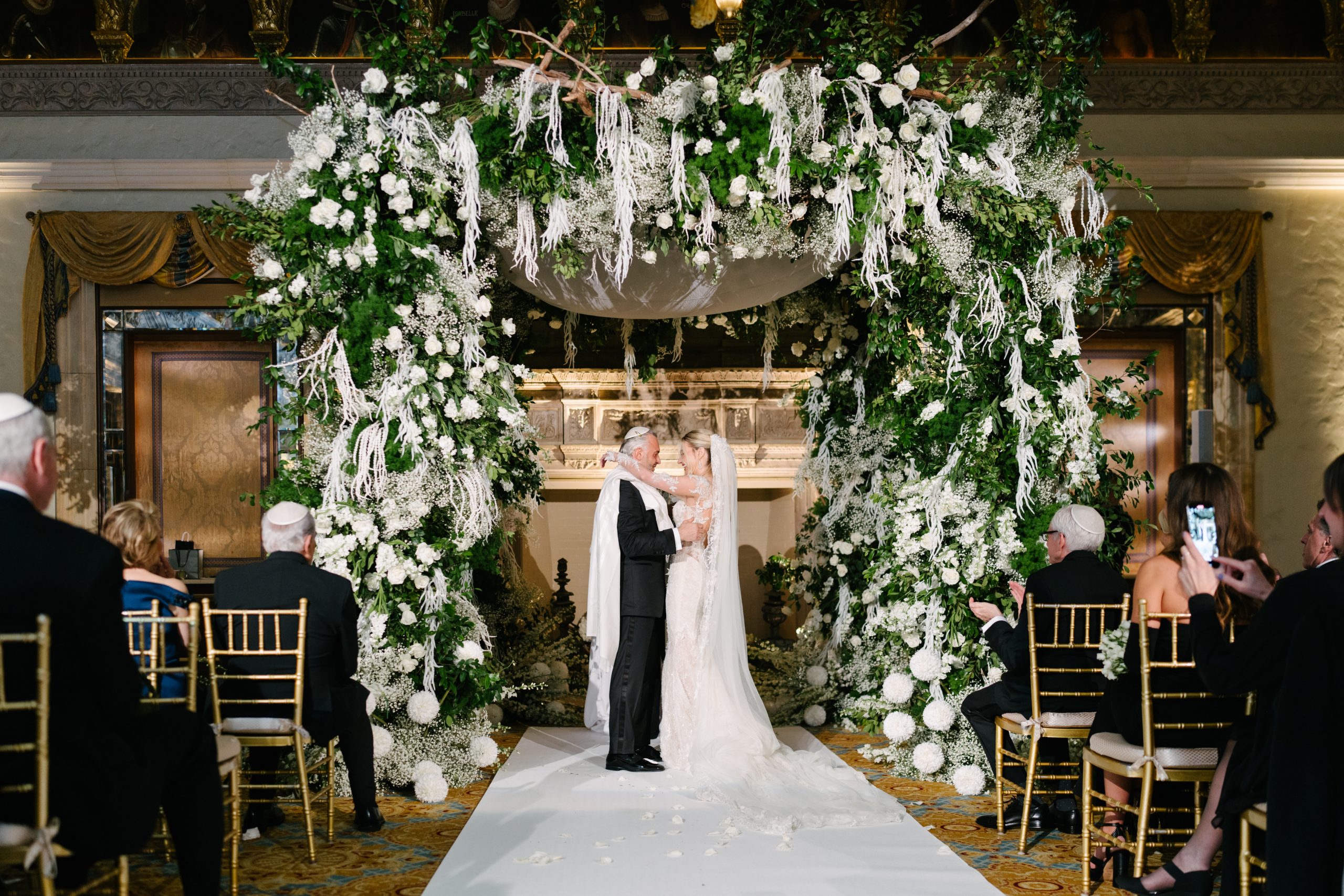 The following day, amidst the elegance of a stunningly adorned room, Kelsey and Afshin exchanged heartfelt vows. Moreover, the architecture complemented by cascading white flowers and lush greenery arch formed a picturesque setting for their union.